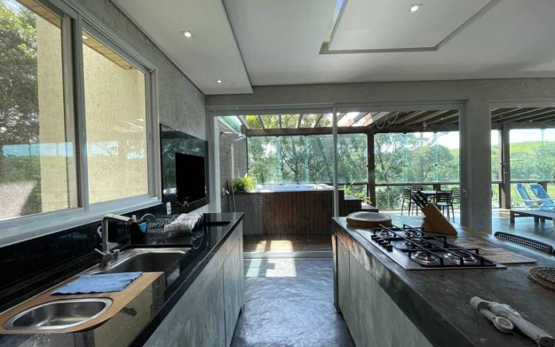 A casa tem um paisagismo impecável , vaios decks e praças diferentes , fogo de chão , churrasqueiras e chuveiros.
