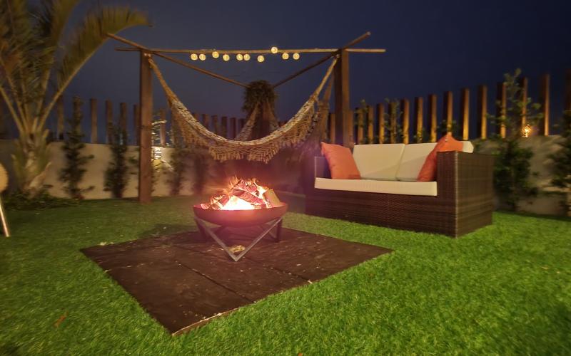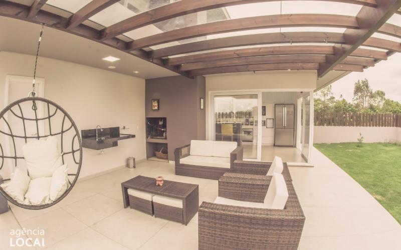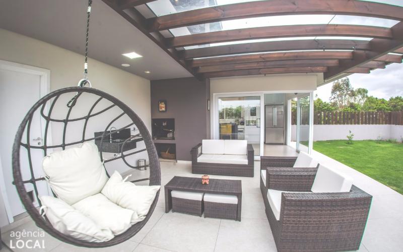 A cozinha gourmet é completa, com churrasqueira, água ionizada, som ambiente, geladeira side by side e adega climatizada. A sala de jantar possui um charmoso jardim de inverno e a sala de estar é aconchegante, com lareira e TV led de 55 polegadas smart. Além disso, o pergolado oferece sofás de vime, uma parrila e um redário para relaxar.
