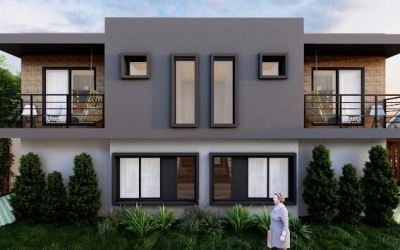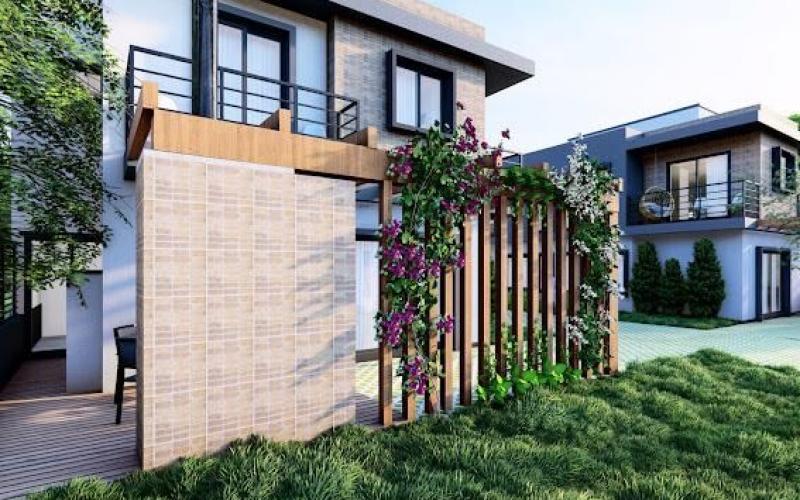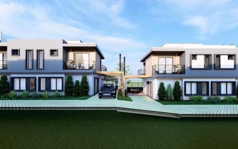 Na parte exterior: uma garagem descoberta, uma varanda/ lavanderia, área de lazer com deck e churrasqueira, seguido de um jardim gramado e pátio com calçamento.
