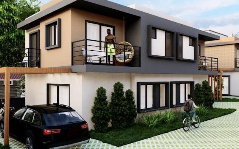 Pavimento térreo: uma sala de estar conjugada com uma cozinha, um dormitório, um banheiro e uma escada que dá acesso ao outro pavimento.